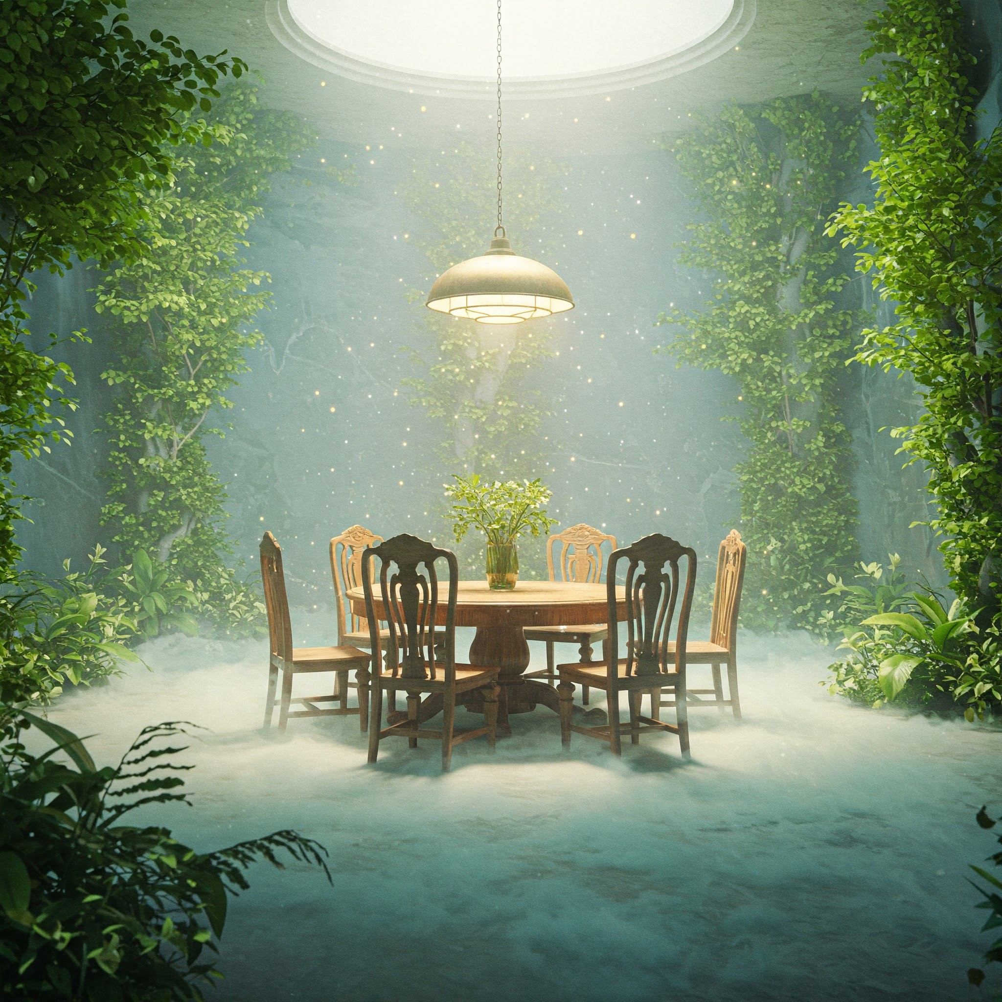 As David followed the five friends into the house, he saw a spacious living room with a round table and chairs set for six.